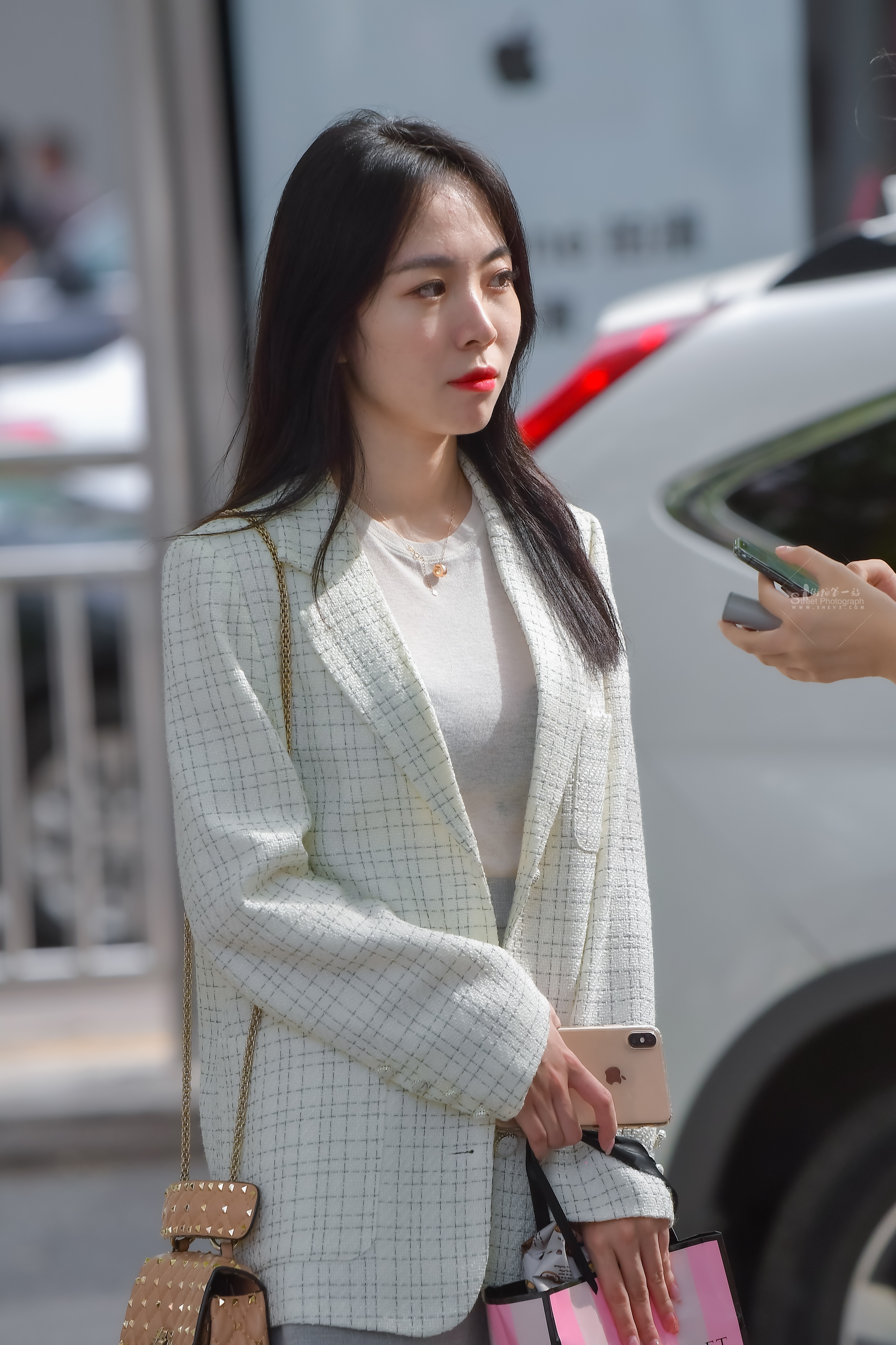 西服装里的时尚之美。姑娘开心的笑了
